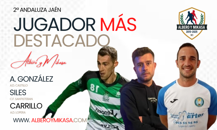 Alberto González, Siles y Carrillo han sido proclamados ‘Jugadores Más Destacados’ de la tercera fecha del calendario de liga en Segunda Andaluza Jaén. Los jugadores de AD Castillo, CF Santisteban y AD Lopera serían elegidos por los usuarios de Albero y Mikasa como los protagonistas de la semana logrando el mayor número de votos en la votación publicada tras la jornada.