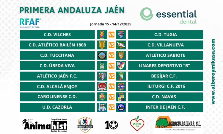 PREVIA J. 15 | Pedro Expósito.- La Primera Andaluza Jaén llegará este fin de semana al final de la primera vuelta con el CD Tugia defendiendo el liderato. En Vilches tratará de proclamarse campeón de invierno el equipo de Peal de Becerro al que vigilarán de cerca, con el mismo objetivo el Carolinense, que recibe al CD Navas, y el Atlético Jaén FC, que cerrará la jornada ante el Begíjar CF. La lucha por entrar en playoff sigue muy emocionante y por abajo Tuccitana y Sabiote viven un duelo directo entre los dos últimos clasificados.