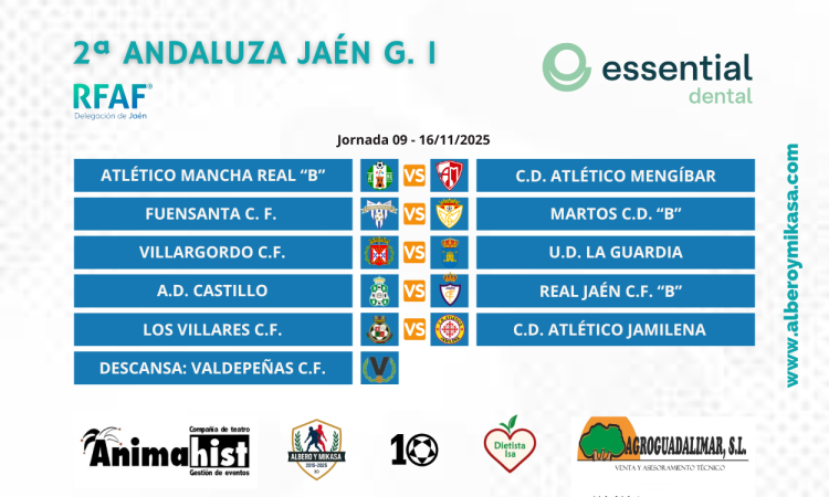 PREVIA J. 09 | Pedro Expósito.- El grupo uno de Segunda Andaluza Jaén llegará este fin de semana a su jornada número nueve con la que se ve ya cerca el ecuador de la competición. El CD Atlético Jamilena llega como líder destacado y no corre riesgo de perder esa condición en Los Villares. Tratarán de recortar distancias el Real Jaén “B” en Castillo de Locubín; el Mengíbar en Mancha Real y el Martos “B” en el derbi que vivirá en Las Banderas. El Villargordo recibirá a La Guardia y el Valdepeñas CF descansará.