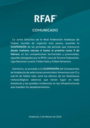 A mediodíoa del jueves la RFAF( Real Federación Andaluza de Fútbol ) ha emitido un comunicado de prensa anunciando que no habrá fútbol en categorías inferiores en este fin de semana, debido a las inclemencias meteorológicas adversos que se están produciendo en la provincia de Málaga. Textualmente dice: "Reunida de urgencia la Junta Directiva de la RFAF, en el día de hoy, se acuerda la suspensión de las jornadas del periodo que transcurre desde mañana viernes 6 de febrero al próximo lunes 9 de febrero de 2026, en las competiciones territoriales y provinciales, como aquellas delegadas por la RFEF".